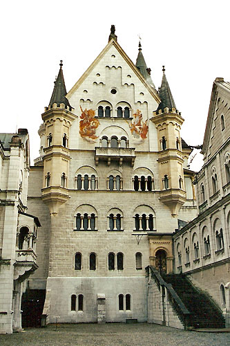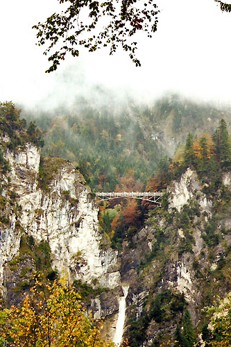 The castle was started in 1869, but remained unfinished at the time of the King's shocking death in 1886. The photos show Castle Neuschwanstein, perched on a rocky outcrop, enveloped by clouds. The western end of the castle contains a vividly decorated throne room, with superb views over the surrounding scenery.